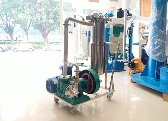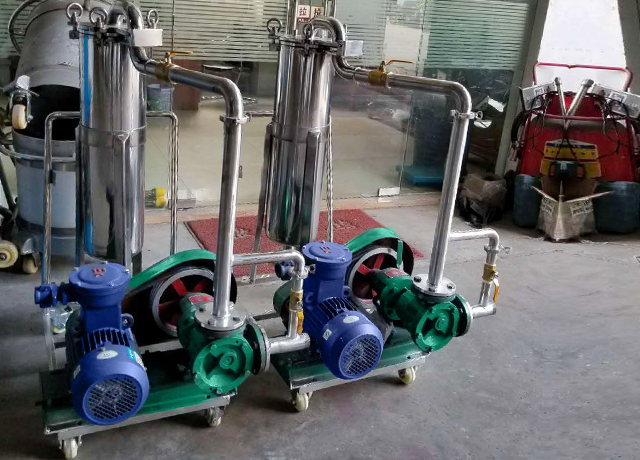 過(guò)濾小車包括了一個(gè)不銹鋼袋式過(guò)濾器、氣動(dòng)隔膜泵、氣源二聯(lián)件、單氣控閥,裝置在不銹鋼手推車上。氣動(dòng)隔膜泵將物料從拉缸或者罐體吸入至過(guò)濾器外殼的旁側(cè)入口管流入濾袋,過(guò)濾掉雜質(zhì)后的物料泵送至灌裝機(jī)進(jìn)行灌裝或者進(jìn)入儲(chǔ)罐儲(chǔ)存。袋式過(guò)濾器是一種壓力式過(guò)濾裝置,主要有過(guò)濾筒體、過(guò)濾筒蓋和快開(kāi)機(jī)構(gòu)、不銹鋼濾袋加強(qiáng)網(wǎng)等主要部件組成,濾液由過(guò)濾機(jī)外殼的旁側(cè)入口管流入濾袋,濾袋本身是裝置在加強(qiáng)網(wǎng)籃內(nèi),液體滲透過(guò)所需要細(xì)度等級(jí)的濾袋即能獲得合格的濾液,雜質(zhì)顆粒被濾袋攔截。不銹鋼移動(dòng)小車,帶萬(wàn)向腳輪,移動(dòng)方便。無(wú)電火花產(chǎn)生,符合防爆要求。